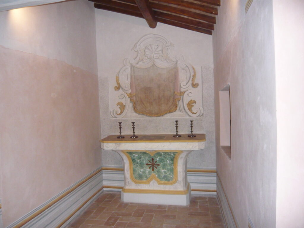 From here, a staircase leads up to the upper level, where there are three more bedrooms and three bathrooms; on this floor there is also a small chapel that was used by the noble family from Spoleto Zachei Travaglini, that used the property as their summer residence. Another interesting historic feature that has been kept is an old toilet with an open shoot to the outside – obviously, not in use.